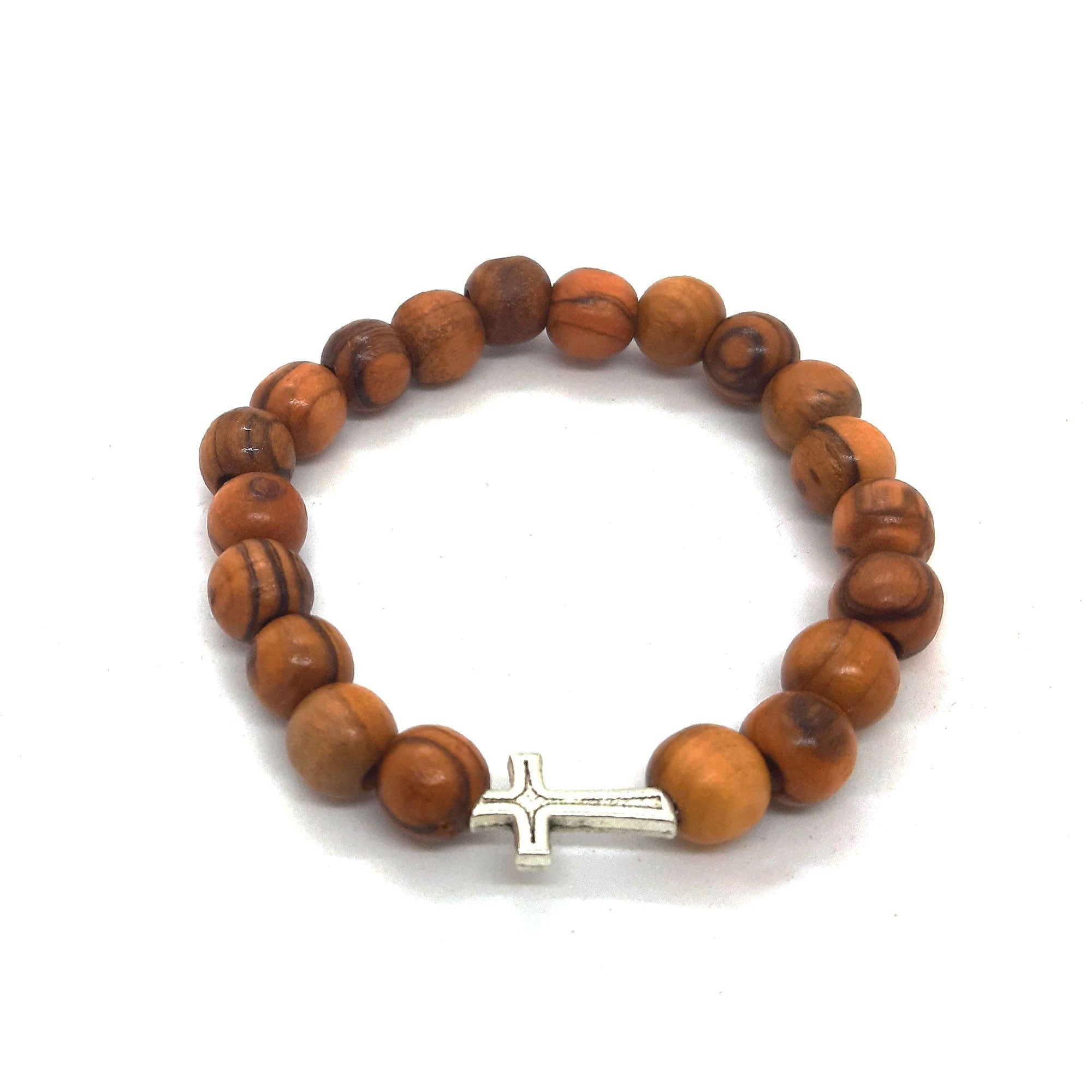 The rosary beads on this elegant bracelet have been individually cut, sanded and polished from olive wood. Incorporated in the bracelet is also the image of the Jerusalem cross and Mother Mary. This is an elasticated bracelet and therefore easy to wear.